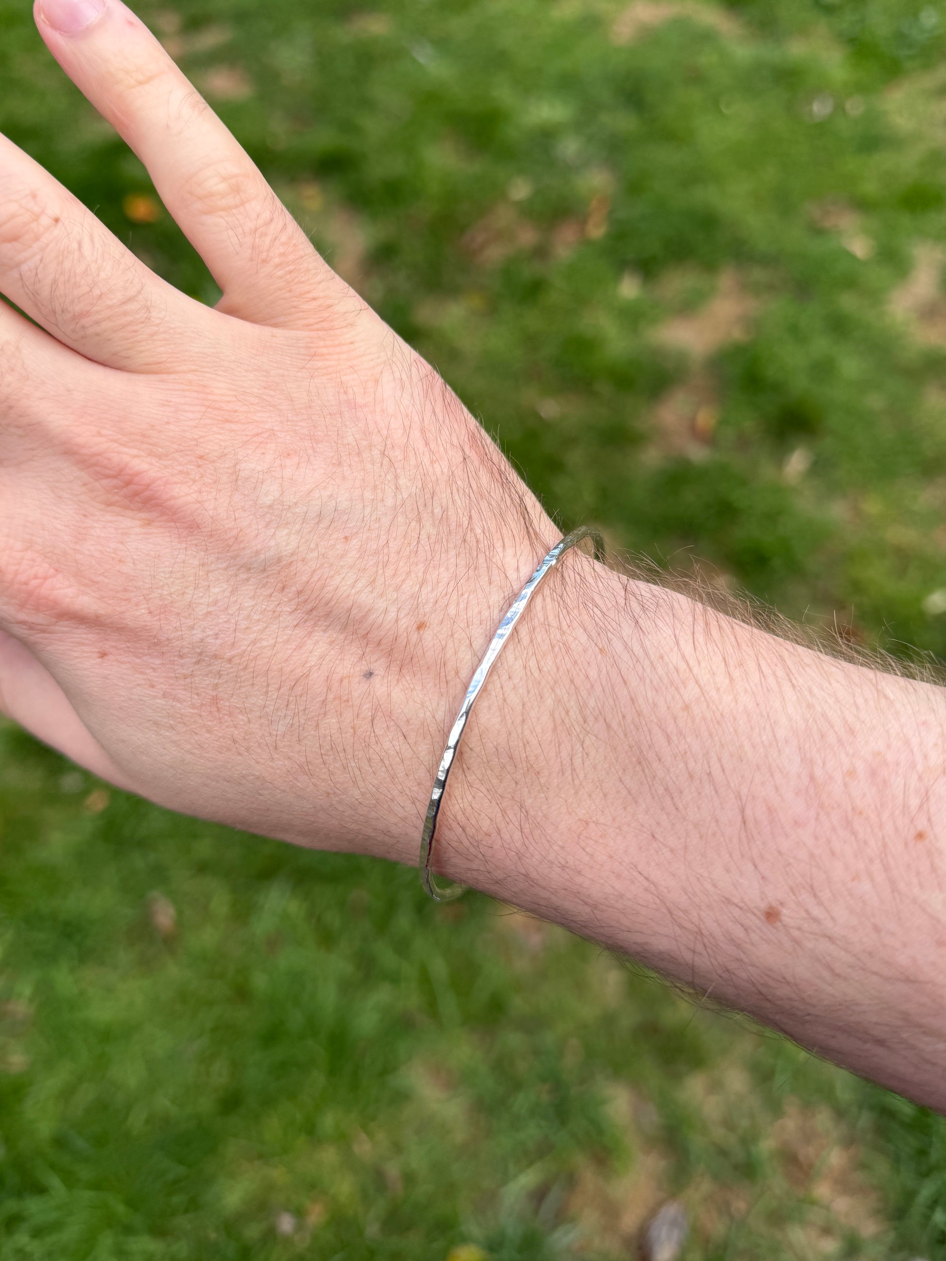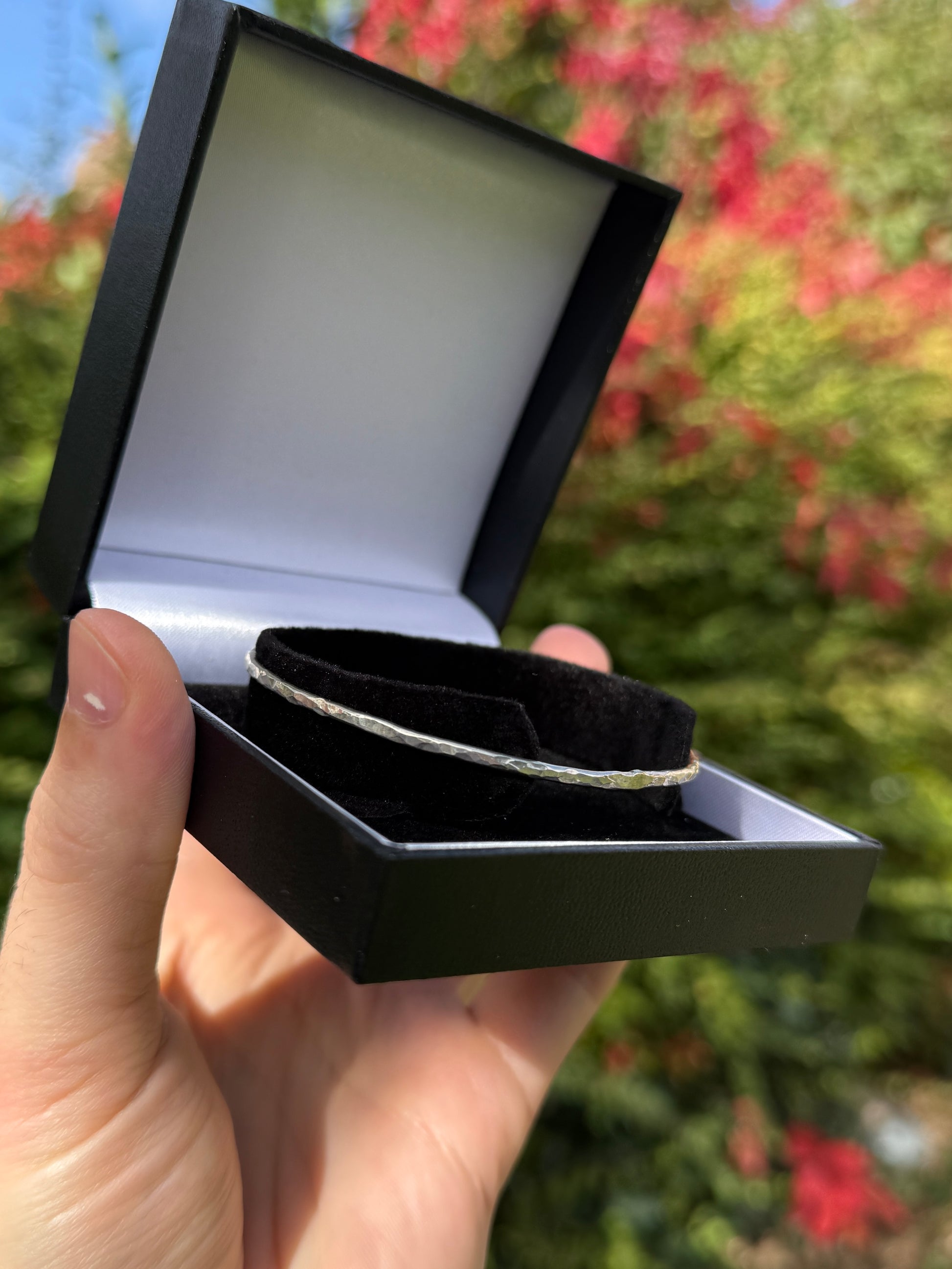 A handcrafted sterling silver bangle with a hammered textured surface that catches the light. The unique finish gives it a bold yet minimalist look, making it the perfect statement piece for everyday wear or a meaningful gift.