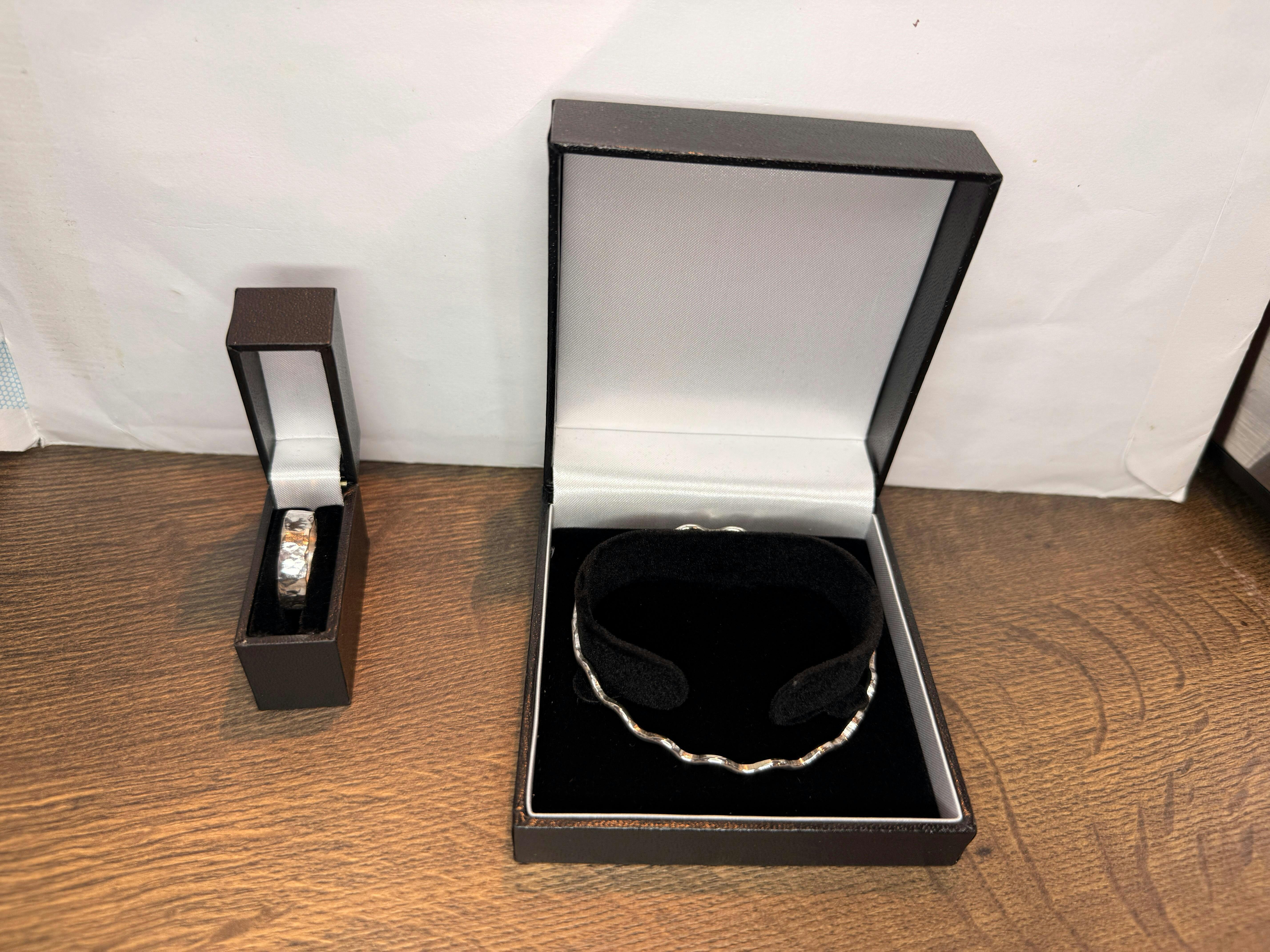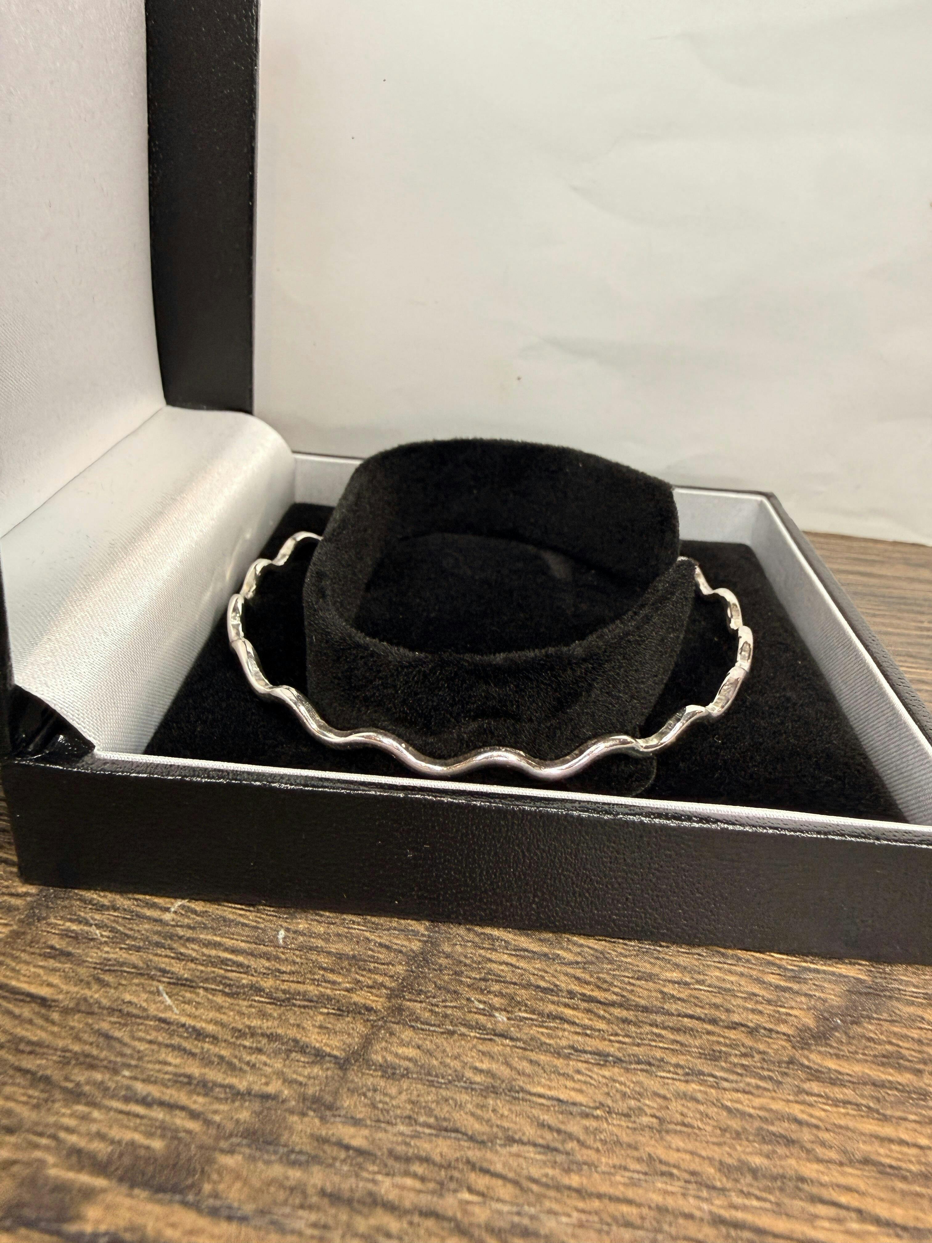 A handcrafted sterling silver bangle with a beautiful waved pattern that adds charm to any look. The unique finish gives it a bold yet minimalist look, making it the perfect statement piece for everyday wear or a meaningful gift.
